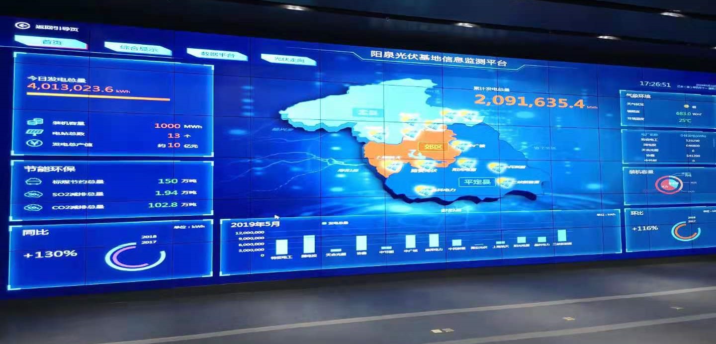 信息平臺(tái)匯集了光伏領(lǐng)跑者項(xiàng)目十三家投資商的實(shí)時(shí)發(fā)電數(shù)據(jù)、地理位置、具體信息。整個(gè)項(xiàng)目裝機(jī)容量為1000MW(兆瓦),年發(fā)電總產(chǎn)值約10億元。以及在建和列入開(kāi)發(fā)方案的共計(jì)48萬(wàn)千瓦風(fēng)電項(xiàng)目。為拓寬平臺(tái)的服務(wù)領(lǐng)域,實(shí)現(xiàn)平臺(tái)的綜合化利用,該平臺(tái)除實(shí)現(xiàn)對(duì)光伏基地整體運(yùn)行情況的實(shí)時(shí)監(jiān)測(cè)外,還可以通過(guò)可視會(huì)議系統(tǒng),實(shí)時(shí)連線(xiàn)重點(diǎn)工程情況。